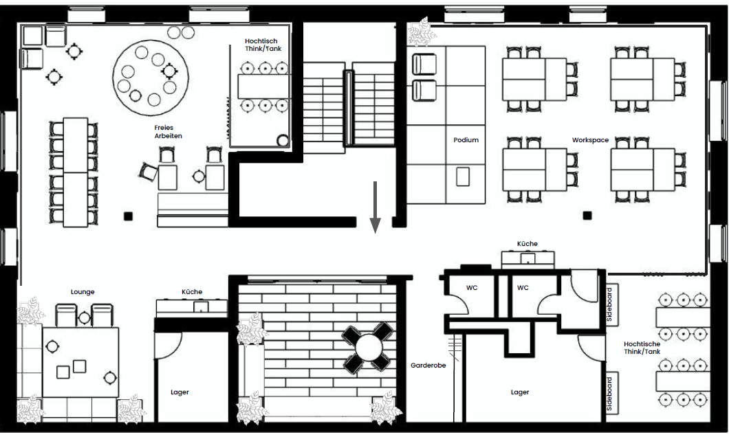 - Podium: ideal für Vorträge, Diskussionen oder Präsentationen