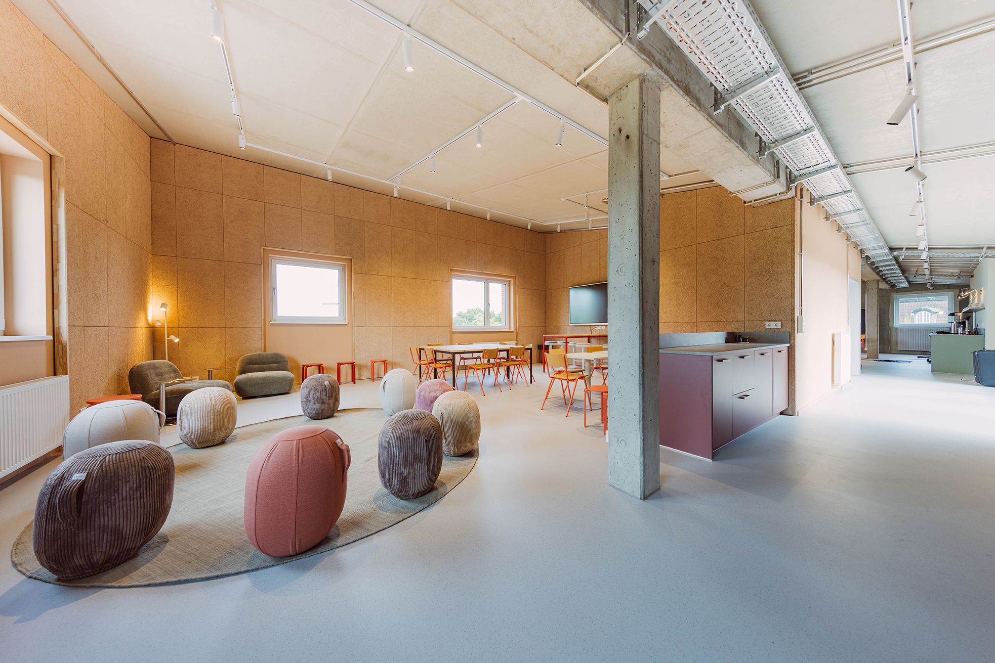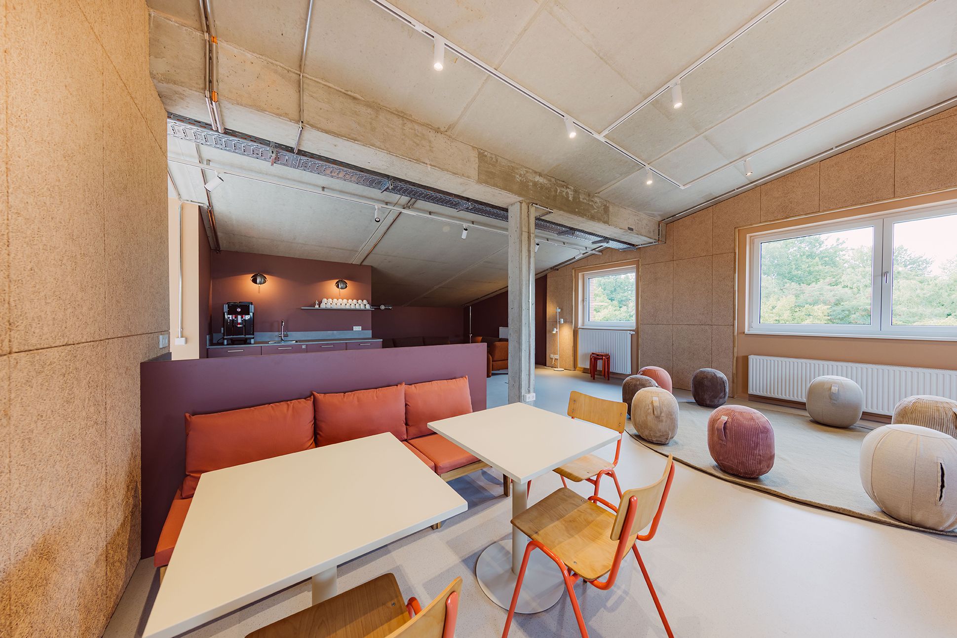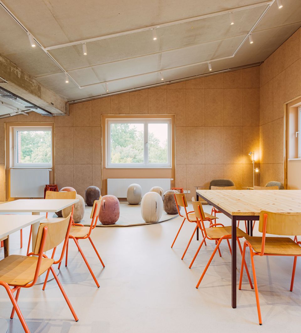 Zwei Perspektiven, ein Raum: Der Werkraum vereint zwei miteinander verbundene Bereiche – einen für Impulse und Inspiration, einen für Austausch und gemeinsames Arbeiten. So entsteht ein flexibles Umfeld für Workshops, Vorträge und Formate, die Dialog und Konzentration verbinden.